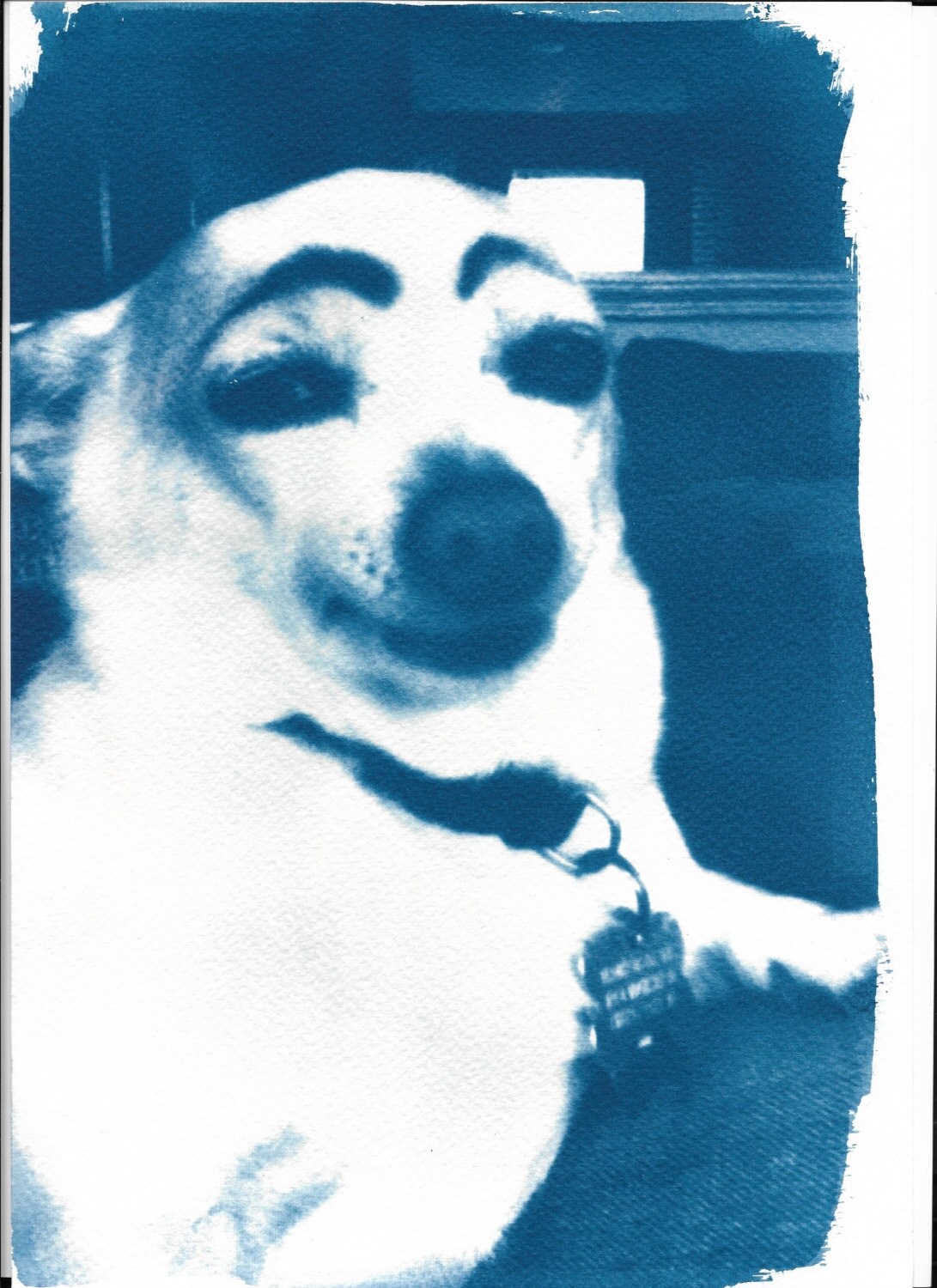 Meme Art Dog With Eyebrows Cyanotype Print On Watercolor Paper