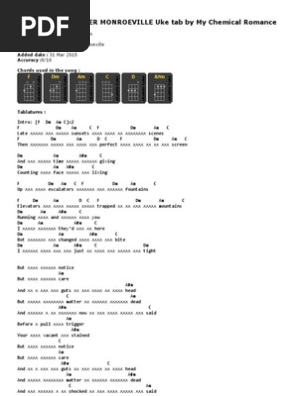 My Chemical Romance Guitar Chords And Tabs Guitartabsexplorer Com. Pin chords to top while scrolling. My chemical romance is an american rock band from new jersey, united states formed in 2001. You can enter any chord and even choose the pitch of each string. Cancer ukulele tablature by my chemical romance, chords in song are d,a,bm,gm,g,a/c,em,f#,bm/c. Ukulele chords and tabs for cancer by my chemical romance. 22k views, 162 views this month. Top songs by my chemical romance. Show diagrams in lyrics new. Lessons guitar piano bass drum ukulele song cover song videos. The band consists of lead vocalist gerard way. Free and guaranteed quality with ukulele chord charts, transposer and auto scroller. Video lessons guitar piano bass drum ukulele song cover song videos. 30,564 views, added to favorites 1,312 times. ↑ back to top | tablatures and chords for acoustic guitar and electric guitar, ukulele, drums are parodies/interpretations of the original songs. Play cancer ukulele using simple video lessons.