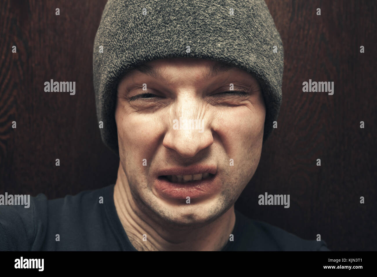 Young Man In Gray Hat Make Ugly Face Close Up Studio Face