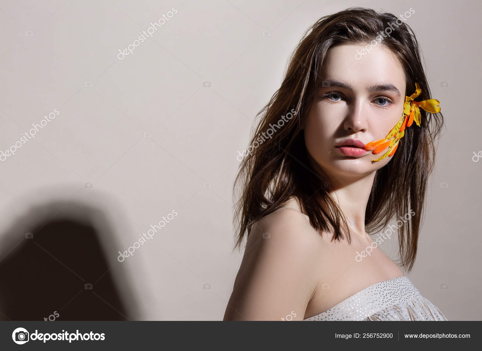 Model With Thick Eyebrows Posing With White Flowers In Hair Stock