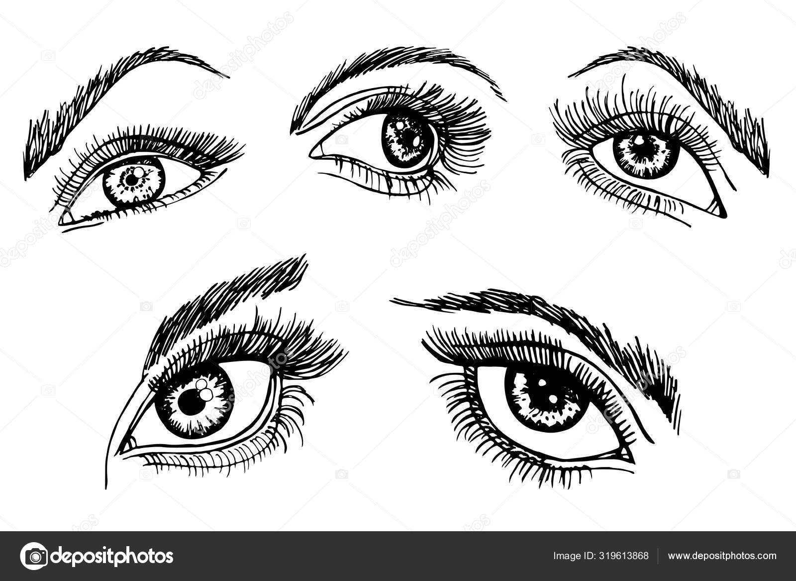 Ink Sketch Female Eyes Eyebrows Set Different Beautiful Eyes Black