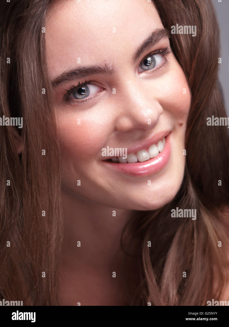 Smiling Woman With Long Hair And Bushy Eyebrows Stock Photo