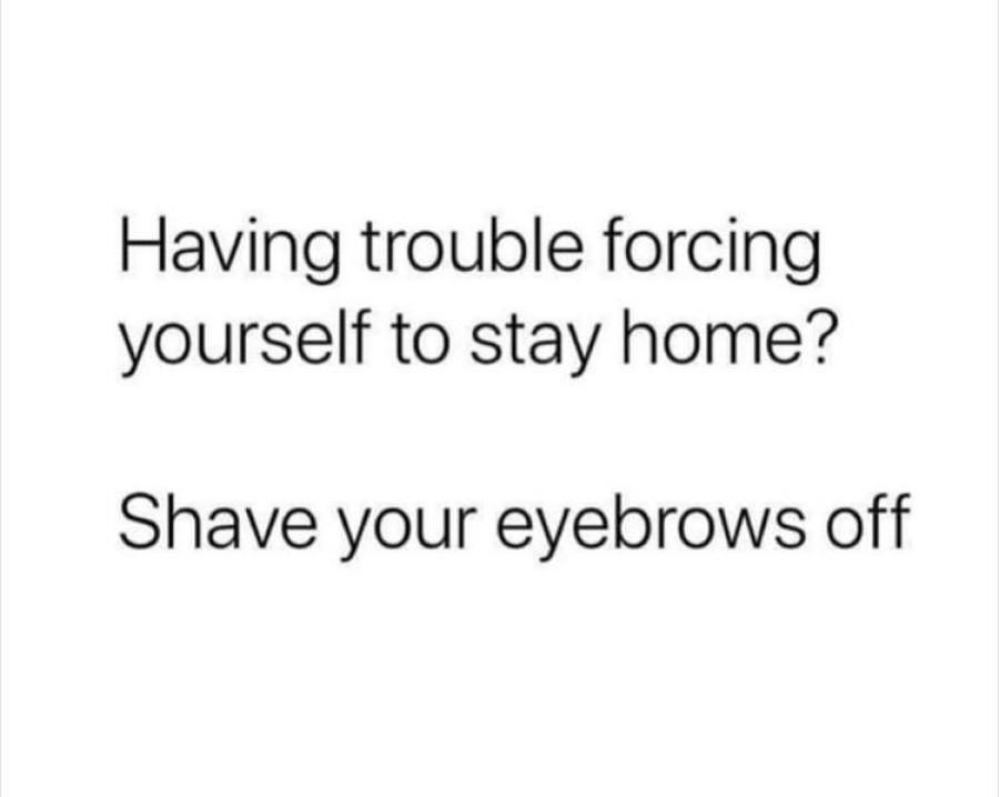 Eyebrows meme stay home. Ill be showing you my all natural recipe for a diy eyebrow tint and how to. What makes a great boyish brow so baby hairs that fall within your natural shape should stay put then do the same with strays beneath your arch. Justin young and justine manuel were sitting at home in kamloops bc when they saw a meme that said if you are having a hard time staying home shave off your eyebrows.