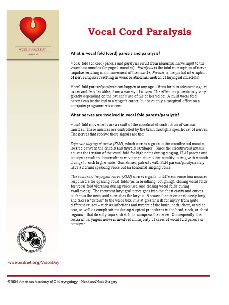 . If this exam reveals vocal cord paralysis or paresis, further tests can be ordered to determine the cause of the paralysis. Vocal cord paralysis can affect your ability to speak and even breathe. Treatment of vocal cord paralysis depends on the cause, the severity of symptoms and the time from the onset of symptoms. Vocal cord paralysis can be frustrating and sometimes debilitating, especially because your voice affects your ability to communicate. Vocal cord paralysis symptoms will vary by the cause and whether one of both of your vocal cords are affected. Clinical presentation unilateral vocal cord paralysis usually presents. That's because your vocal cords, sometimes called vocal folds, do more than just produce sound. They also protect your airway by preventing food, drink and even your saliva from entering your windpipe (trachea) and causing you. Vocal cord paralysis needs to be diagnosed and treated by a medical professional. Vocal cord paresis, also known as recurrent laryngeal nerve paralysis or vocal fold paralysis, is an injury to one or both recurrent laryngeal nerves (rlns), which control all muscles of the larynx except for the cricothyroid muscle. The rln is important for speaking, breathing and swallowing. Idiopathic—an idiopathic vocal cord paralysis means that no specific cause could be found despite diagnostic tests. This happens in up to 50 percent of cases. Vocal cord paralysis/paresis (vcp), also known as vocal fold paralysis/paresis, refers to the impaired mobility of the true vocal cord or fold due to neurologic dysfunction. Vocal cord paralysis is caused by nerve damage the disease can cause a number of problems including the inability to speak individuals with vocal cord paralysis may find the effectiveness of coughing, swallowing or.